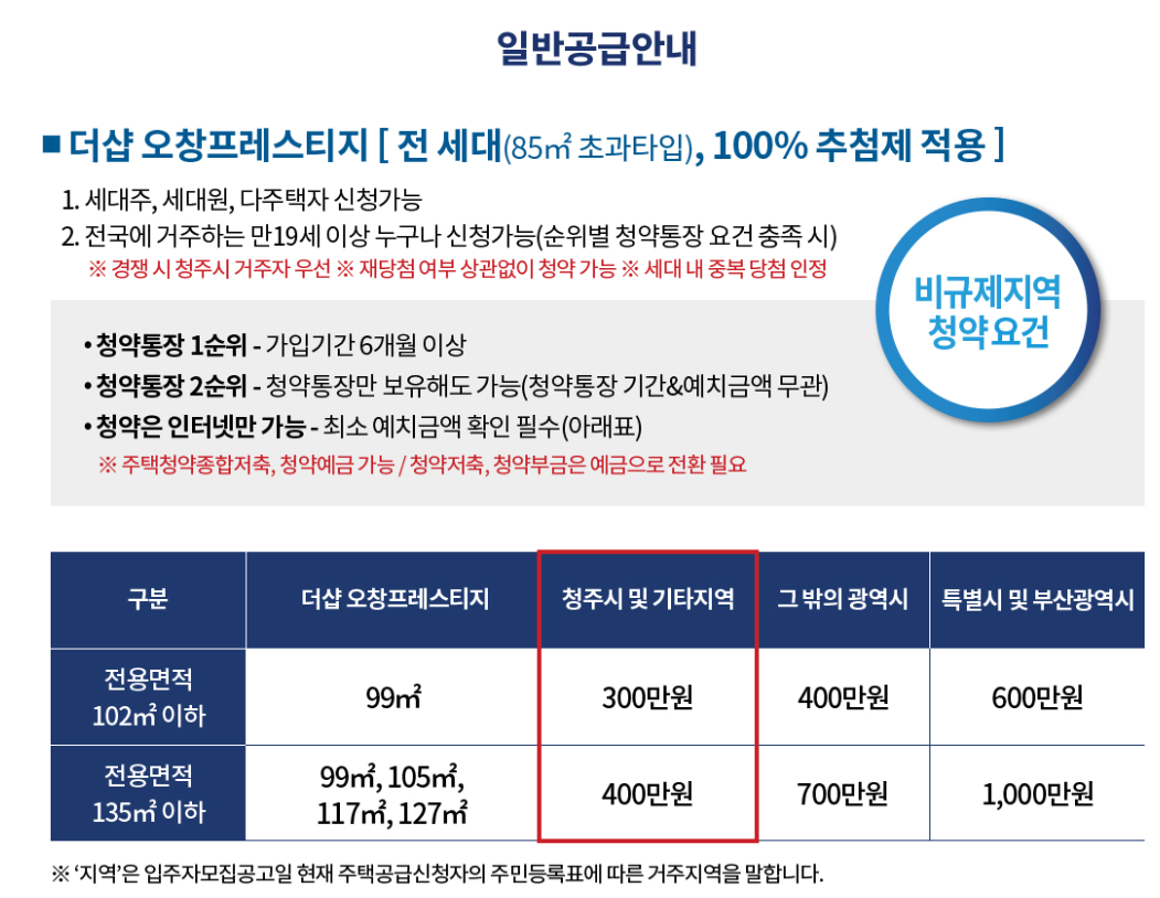 포스코이앤씨 분양관계자는 "더샵 오창프레스티지는 전국 만19세 이상이라면 다주택자는 물론 세대주, 세대원 누구나 청약이 가능하고, 전 가구 중대형 구성으로 100% 추첨제가 적용돼 청약 당첨 기회가 상대적으로 높은 것이 장점”이라며 “또 전매제한이 없고, 재당첨제한도 적용되지 않아 벌써부터 많은 관심이 이어지고 있다"고 말했습니다.
