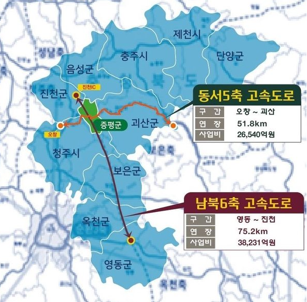 이번 계획에는 동서5축(당진~천안~오창~증평~문경~울진) 구간인 오창분기점~증평~연풍 분기점을 잇는 51.8㎞(사업비 2조 6540억원)가 반영됐다.
