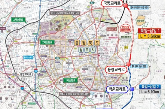 청원구 내수읍 국동리~상당구 남일면 효촌리(11.74㎞) 구간 중 2공구에 해당하는 '용정교차로~효촌교차로'가 내년 하반기 개통을 계획하고 있다.