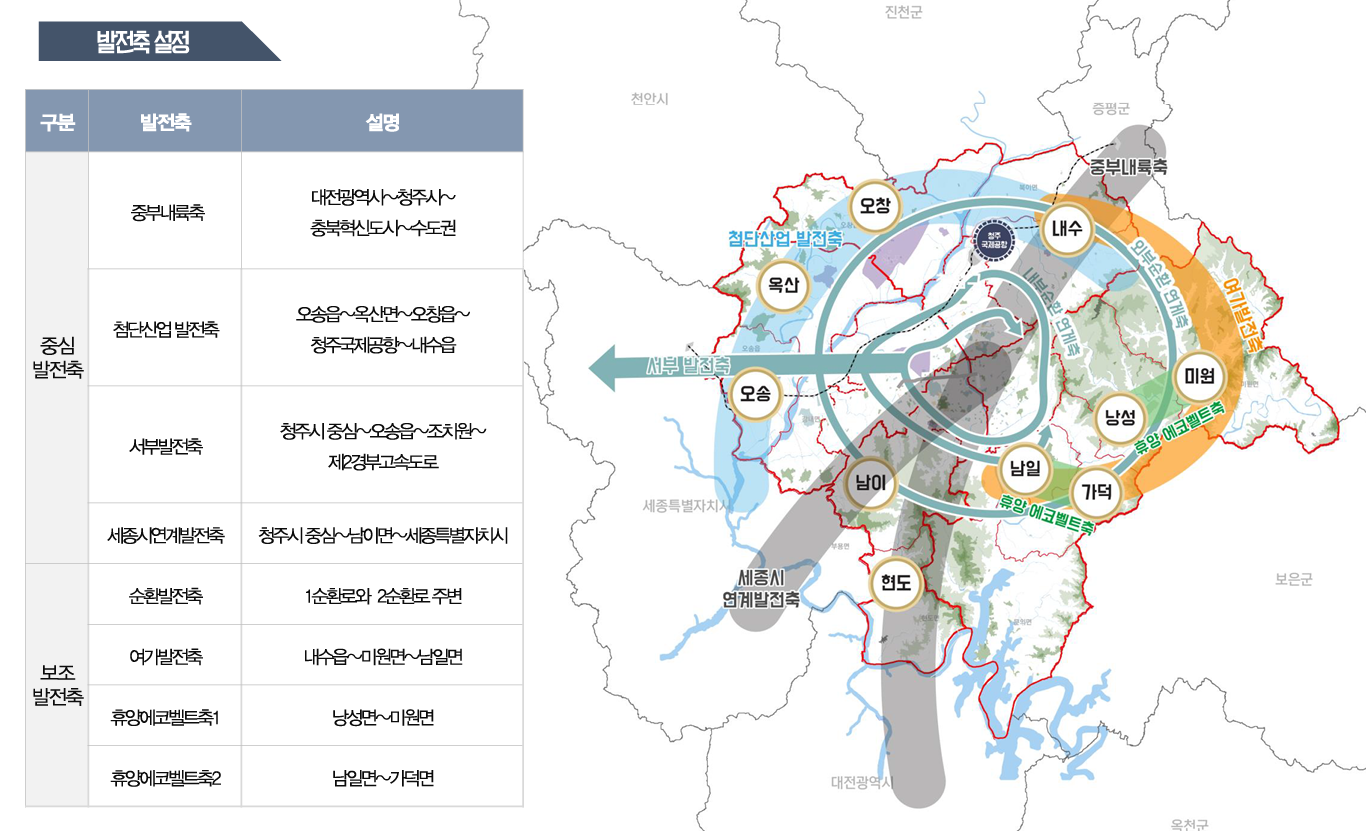 | 첨단산업 발전축 | 오송읍〜옥산면〜오창읍〜청주국제공항~내수읍 | |